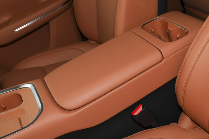 在储物空间方面,前排的重工业扶手箱设计得很深,9.4 升的容积可以轻松塞下六罐饮料和一些杂物,而且还做了分层设计,方便放置证件、停车卡等小物件。第二排的小桌板实用性很强,只需一声语音指令就能展开,无论是办公还是放置物品都非常方便。晚上开车时,车内的 256 色氛围灯可以调节亮度,既不会影响视线,又能随着音乐和模式的变化营造出丰富的车内氛围。